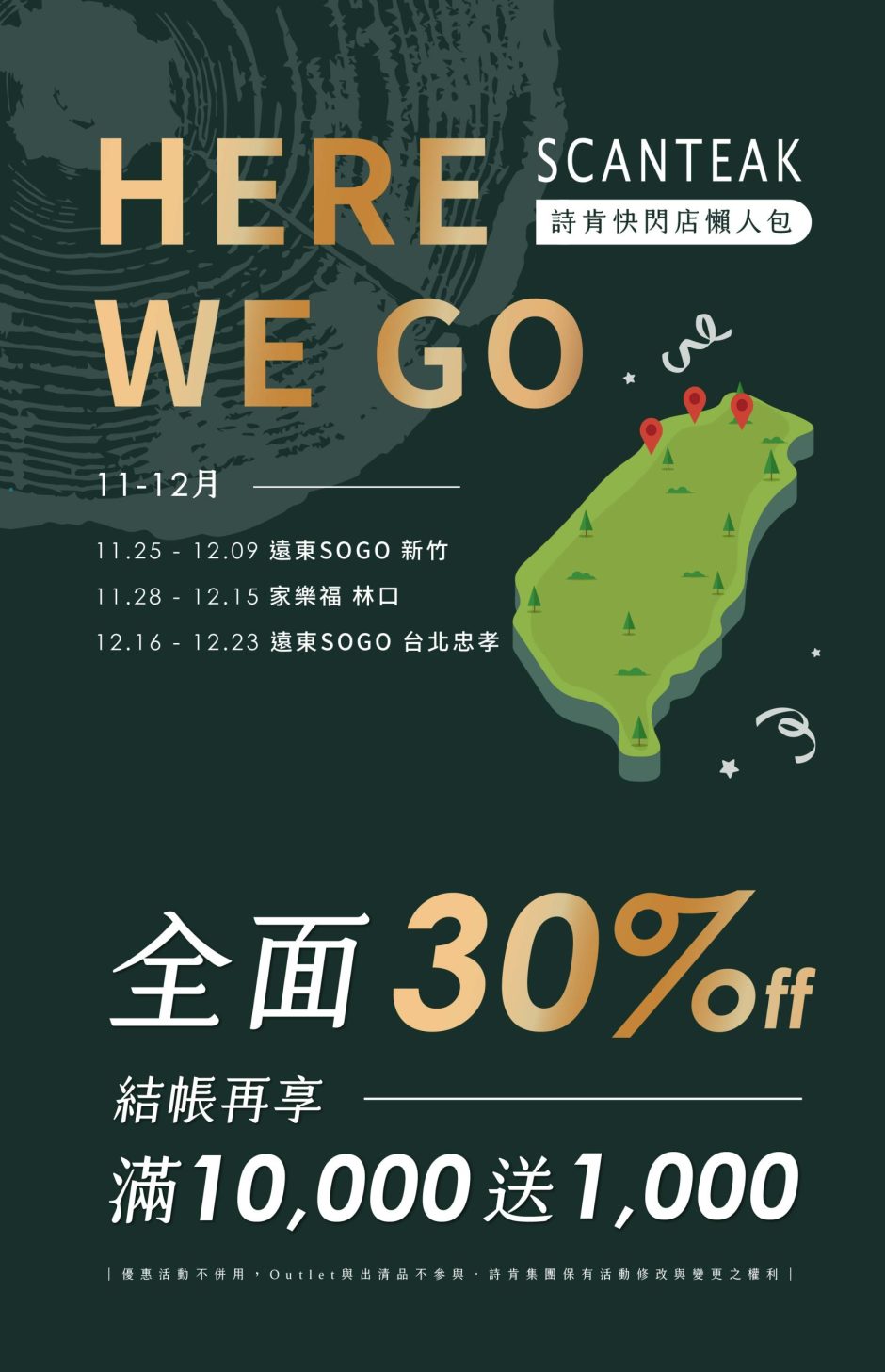 1.快閃店參加全面30%OFF結帳再享滿10,000送1,000活動。2.限快閃店活動期間享詩肯 滿10,000送1,000 活動,訂單付款滿 $10,000 現折 $1,000,依此類推,折抵無上限。3.詩肯滿10,000送1,000活動若與百貨、量販、特力及臨時櫃通路優惠重疊時,則以通路優惠為主則不併用詩肯滿10,000送1,000活動。4.詩肯集團保有活動內容變更及最終解釋之權力,活動詳情請洽實體門市人員。